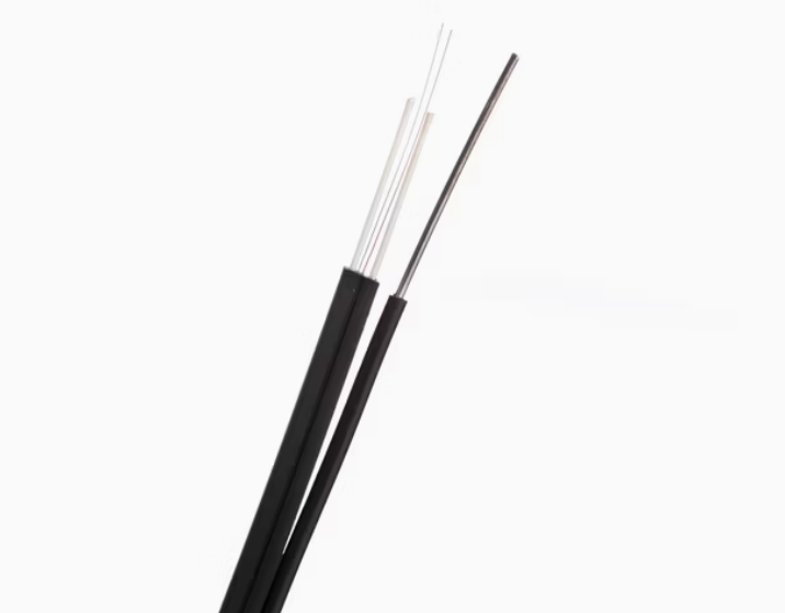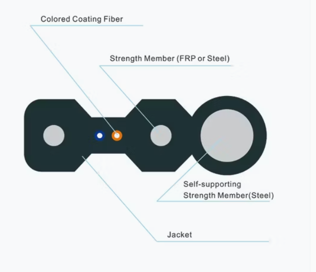 Self-supported flat drop cable. The cable cross section is a fig.8 made a steel wire strength member.